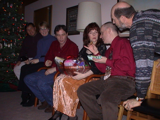 Caption: Everyon trying to decide if they should steal a present or open a new one.