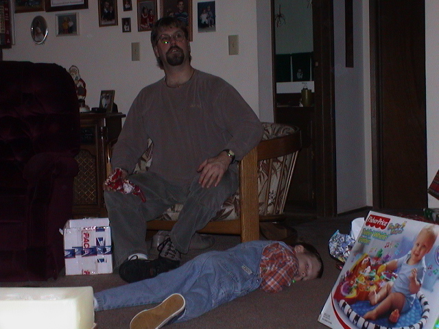 Caption: Uncle Dave looking at something across the room and Kaleb on the floor.