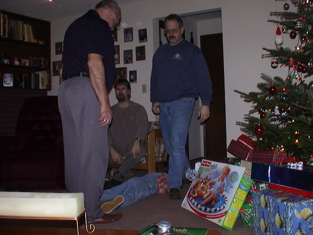 Caption: Grandpa, Uncle Dave, Uncle Ron and Kaleb putting stocking stuff away.