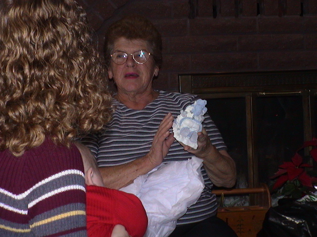 Caption: Look, Grandma got snowmen, she loves snowmen.