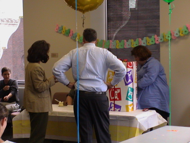 Caption: Kathy, Peter and Sandra opening Peter and Kathy's gift.