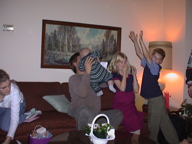 Caption: Jen putting presents away, Uncle Dave holding Logan, Lisa and Erik hamming it up.