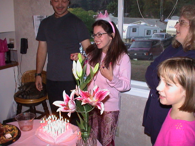 Caption: Juliet preparing to blow out the cake.