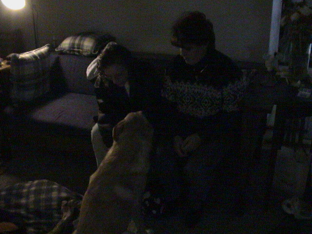 Caption: Beth McKennon and Monica Mustard petting Maya.