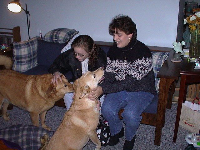 Caption: Beth petting Baja and Monica getting love from Maya.