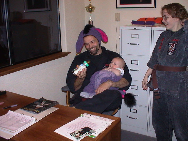 Caption: Mr. Graves pretending not to enjoy holding Logan, Ms. McKennon laughing.