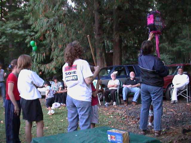Caption: Mrs. Mustard (Monica) reinforces the piñata with some duct tape