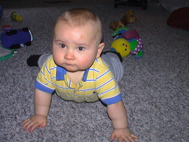 Caption: If you look at the left side of Logan's forehead, you will notice his first bruise.