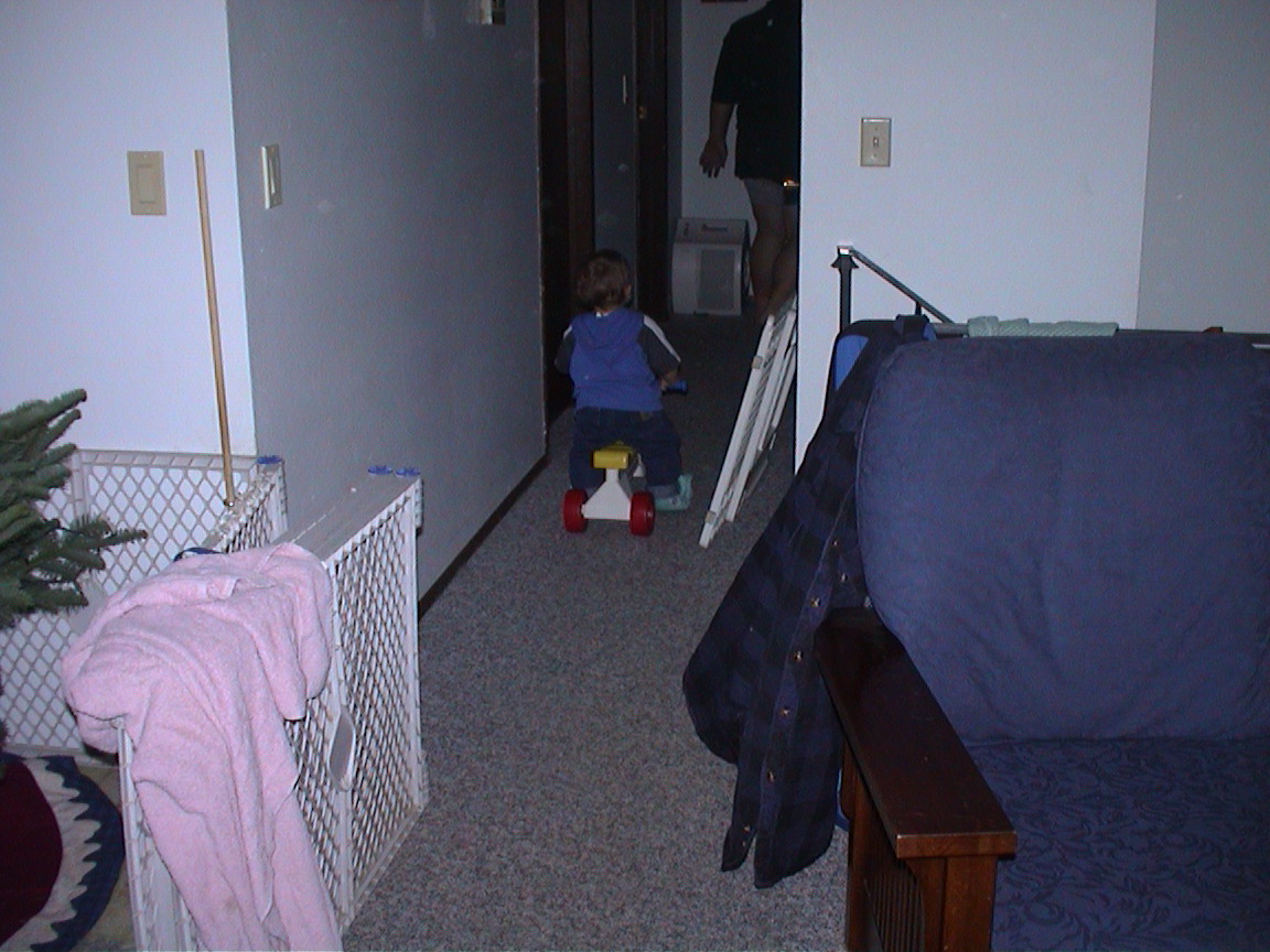 Caption: Logan riding his bike down the hall.