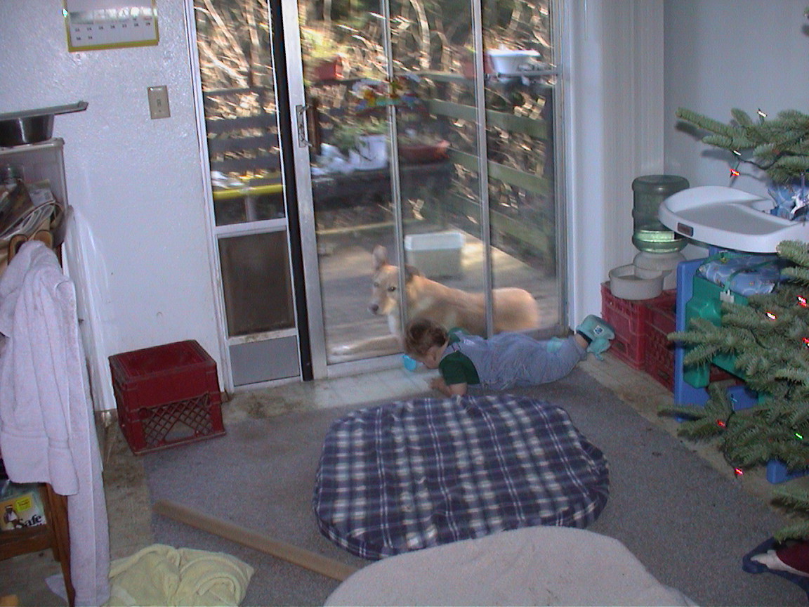 Caption: Logan laying inside and Maya laying outside. CUTE!!!