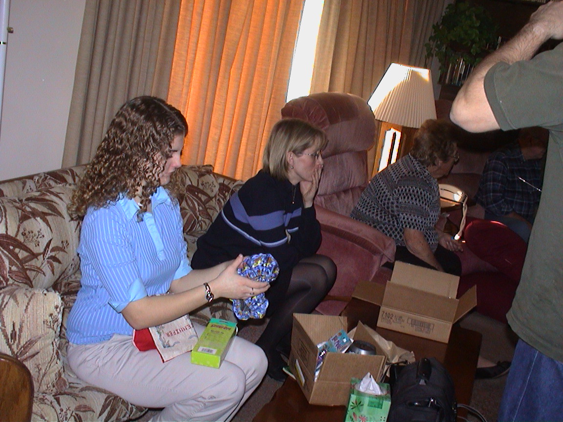 Caption: Jennifer, Marianne and Grandma/Mom looking at stocking stuff.