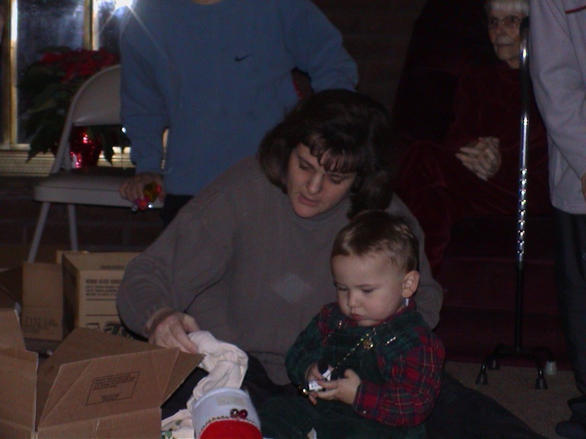 Caption: Aunt Kari and Logan looking at stocking stuff.