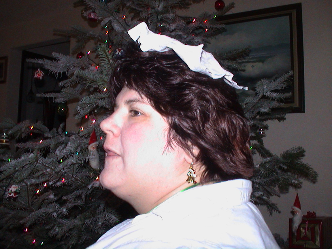 Caption: Lovely picture of Sandra with a tissue on her head.