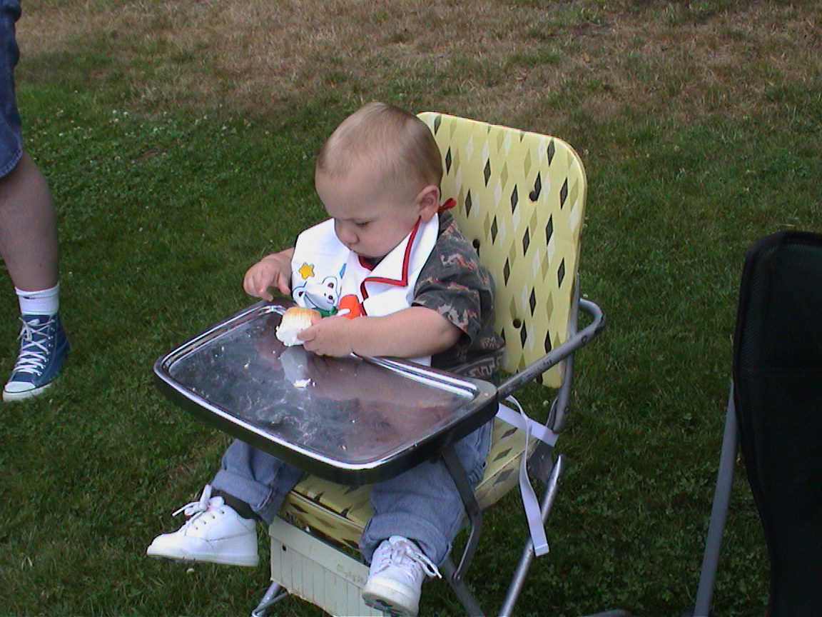 Caption: Logan looking at his first cake.