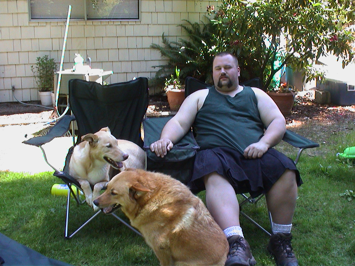 Caption: Baja, Maya and Timm relaxing in the front yard.