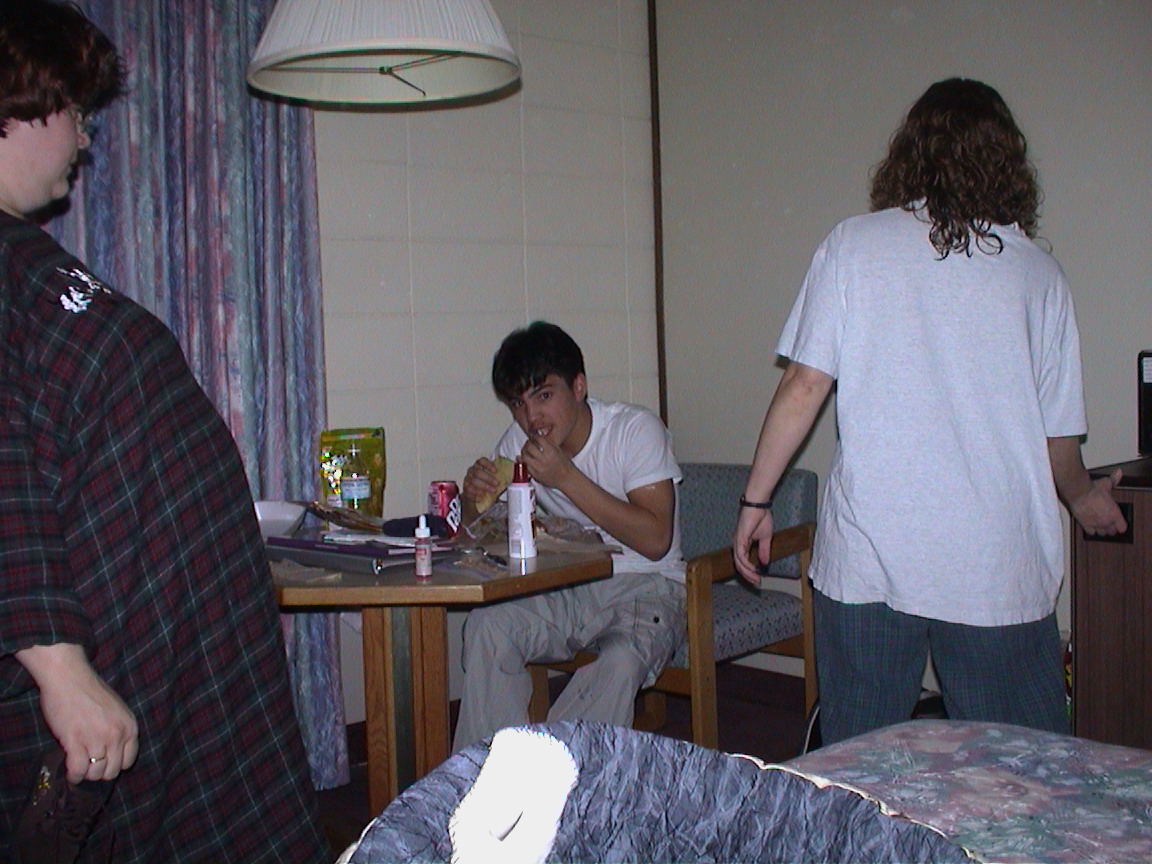 Caption: Sandra, Richard and Beth in the hotel room.
