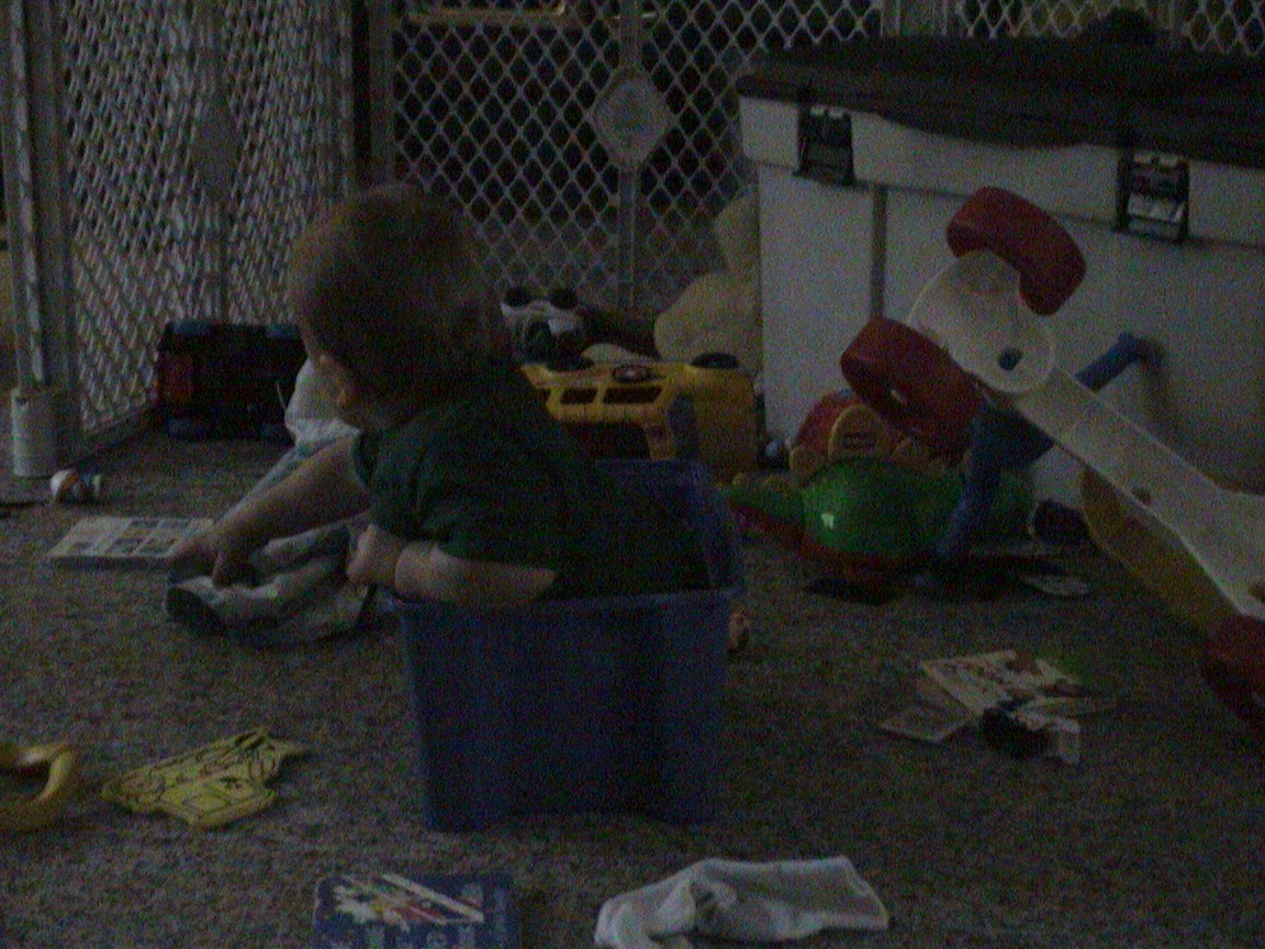 Caption: Logan surrounded by toys.