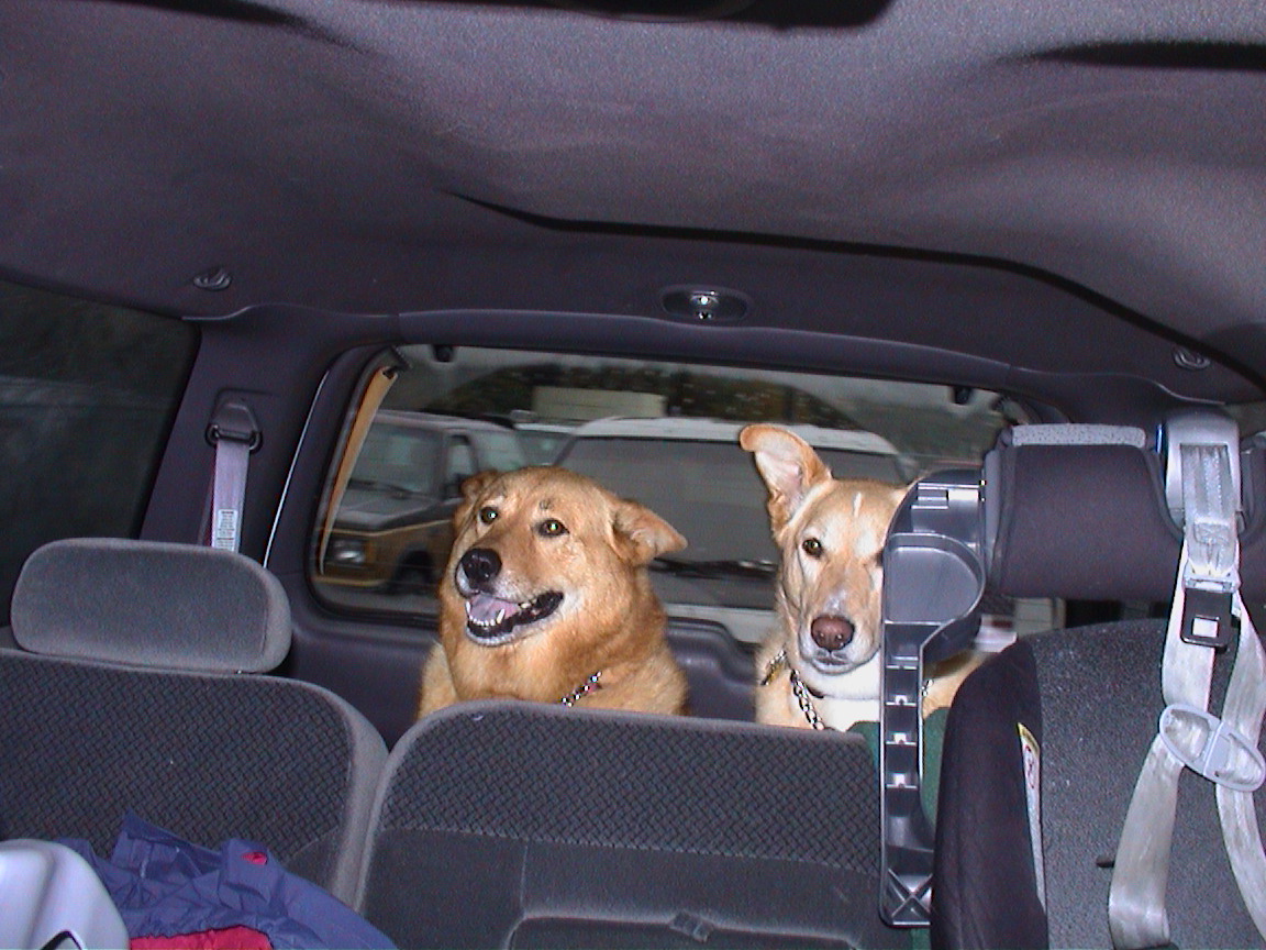Caption: Baja and Maya sitting in the car waiting for the ferry.