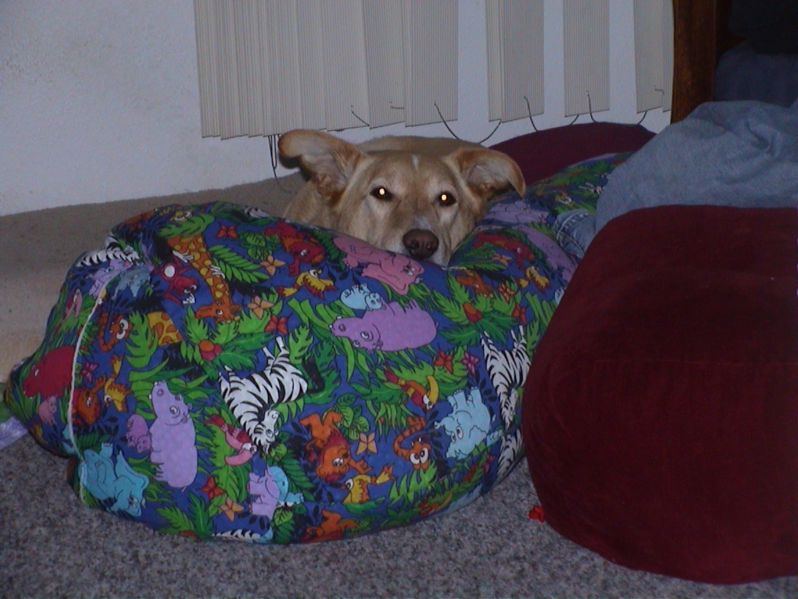 Caption: Maya enjoying herself on Logan's beanbag chair.