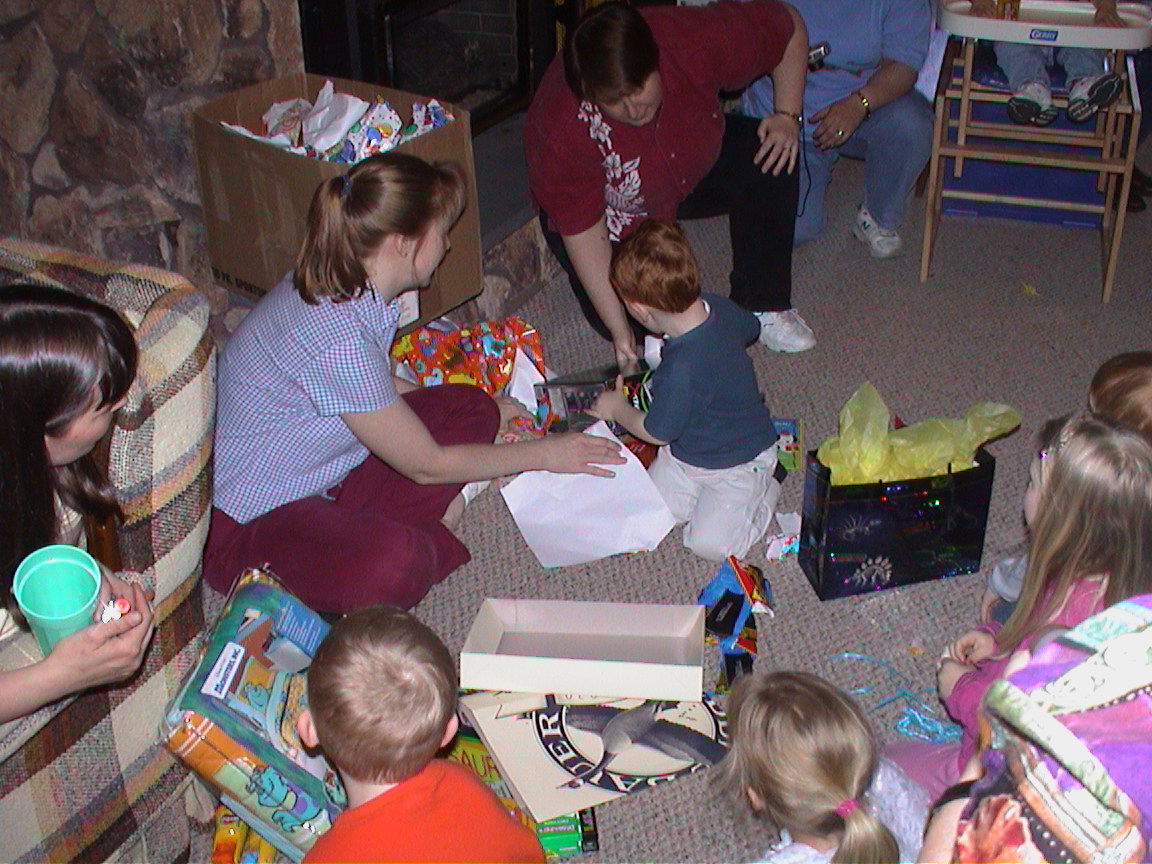 Caption: Kristi helping Walt open more presents.