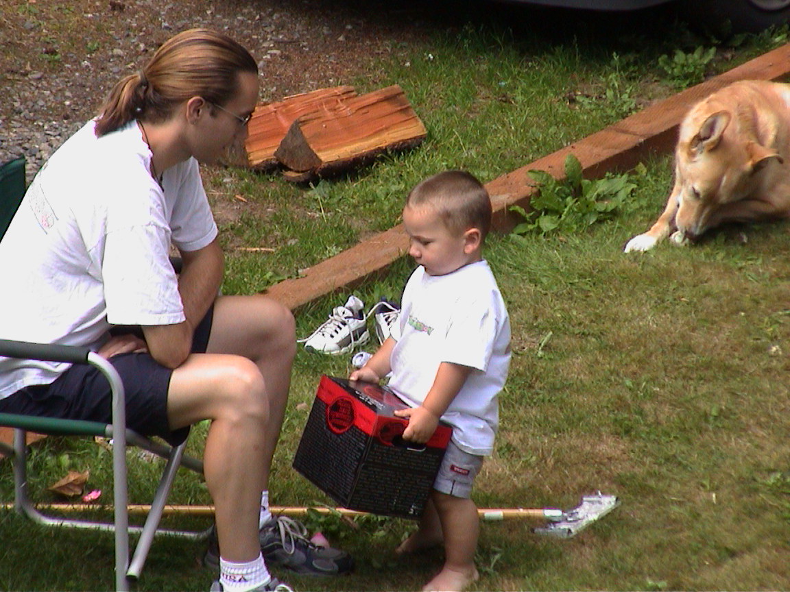Caption: Uncle Doug and Logan. Logan wants to know if he wants a lemonade.