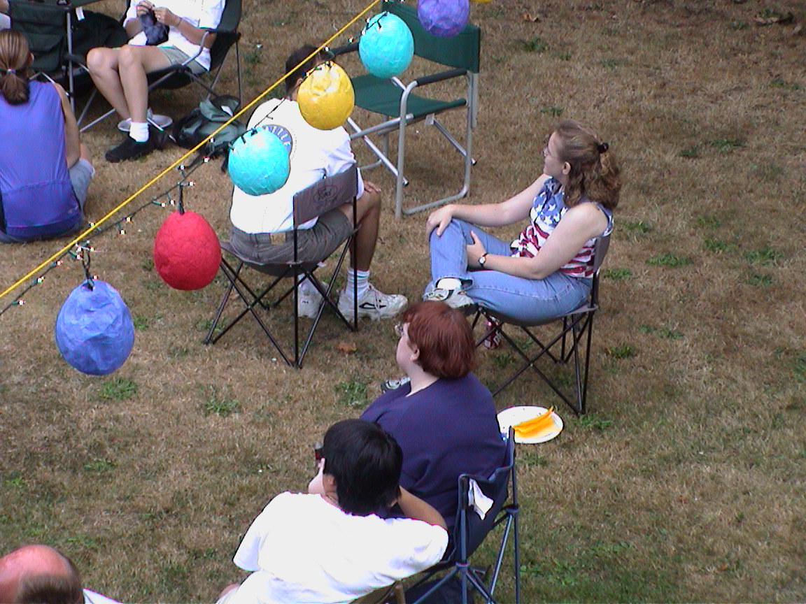 Caption: Dora (with her back to us), Indra (in blue), Beth and Doug enjoying our party.