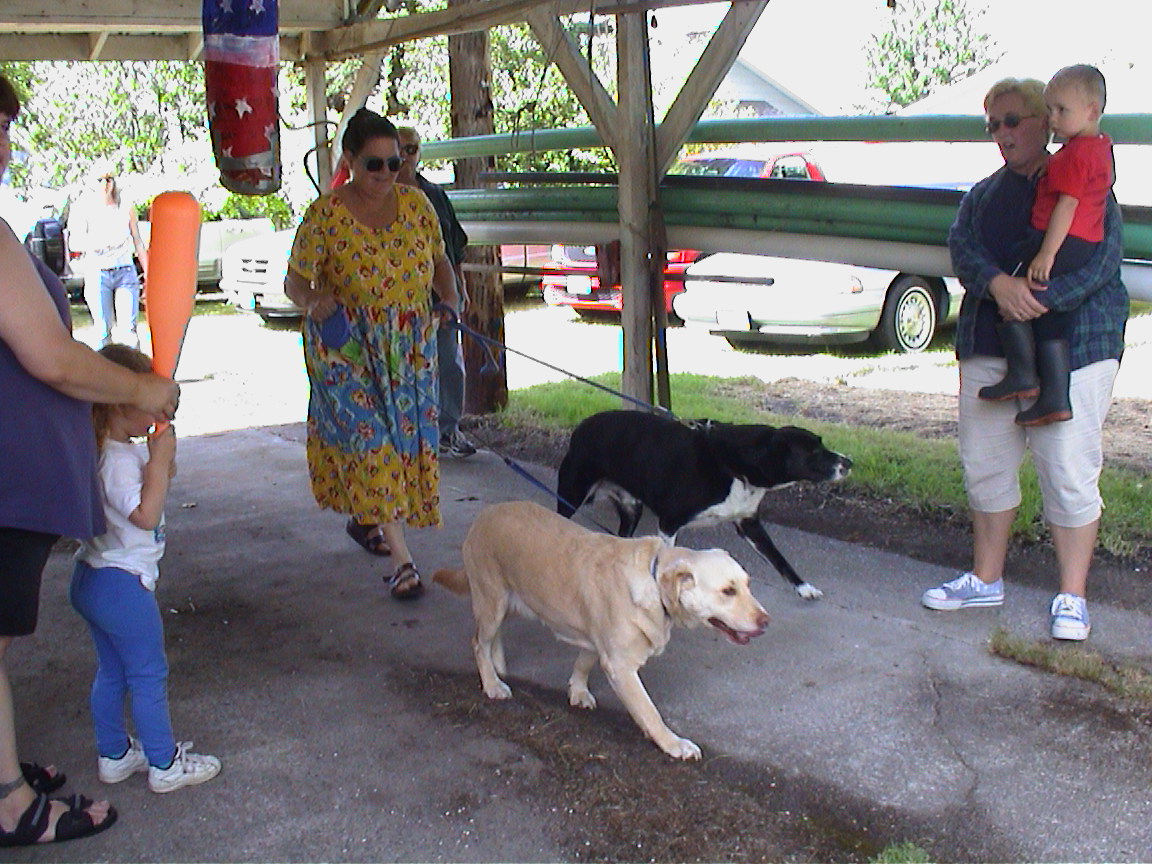 Caption: Diane walking her dogs Buster and Sadie.
