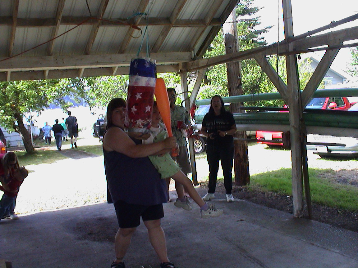 Caption: Sandra helping Rebecca break the pinata open.