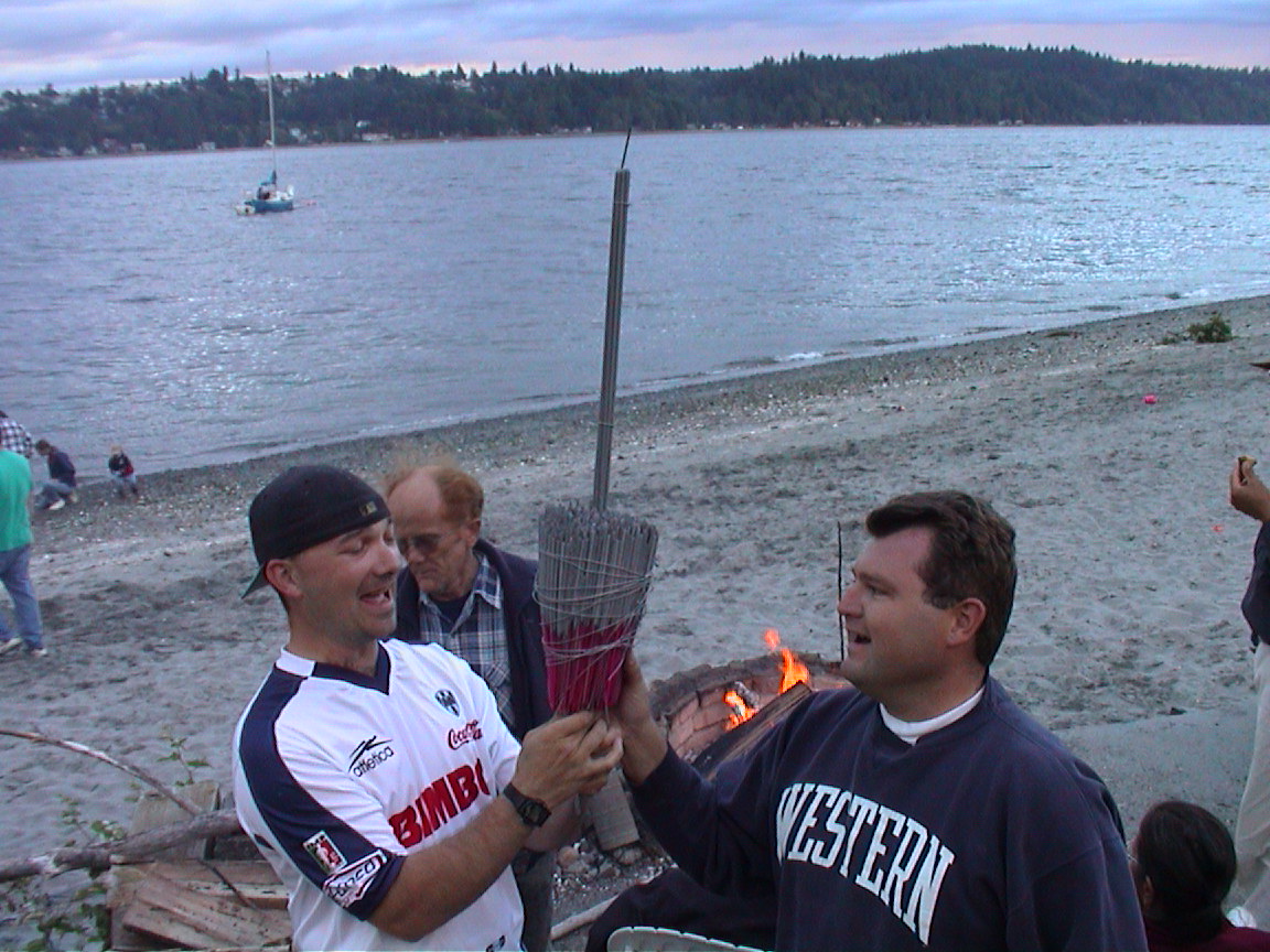 Caption: Jeff and Pasha with sparkler bomb and Herb in the background.