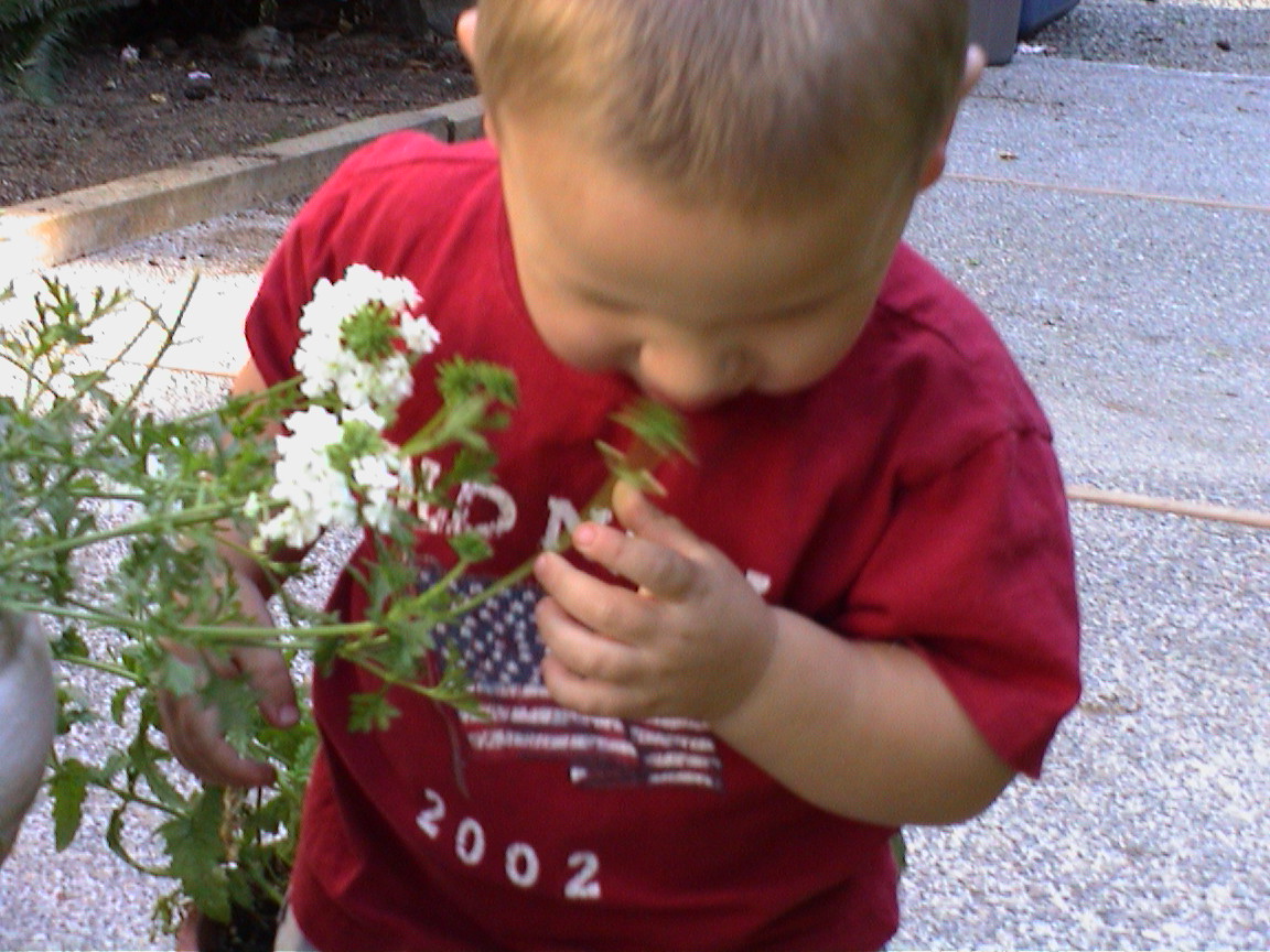Caption: Logan enjoying mom's flowers