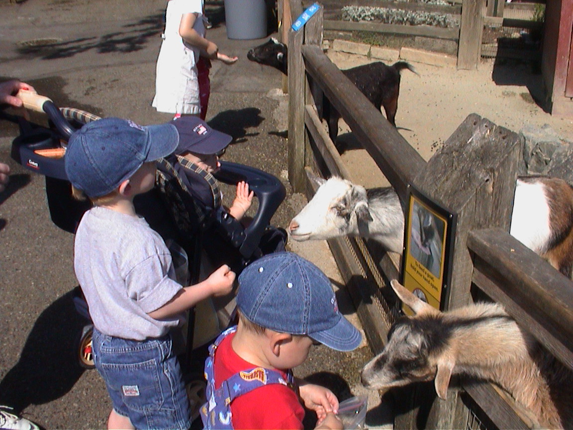 Caption: Lucas, Jared and Logan feeding the goats.