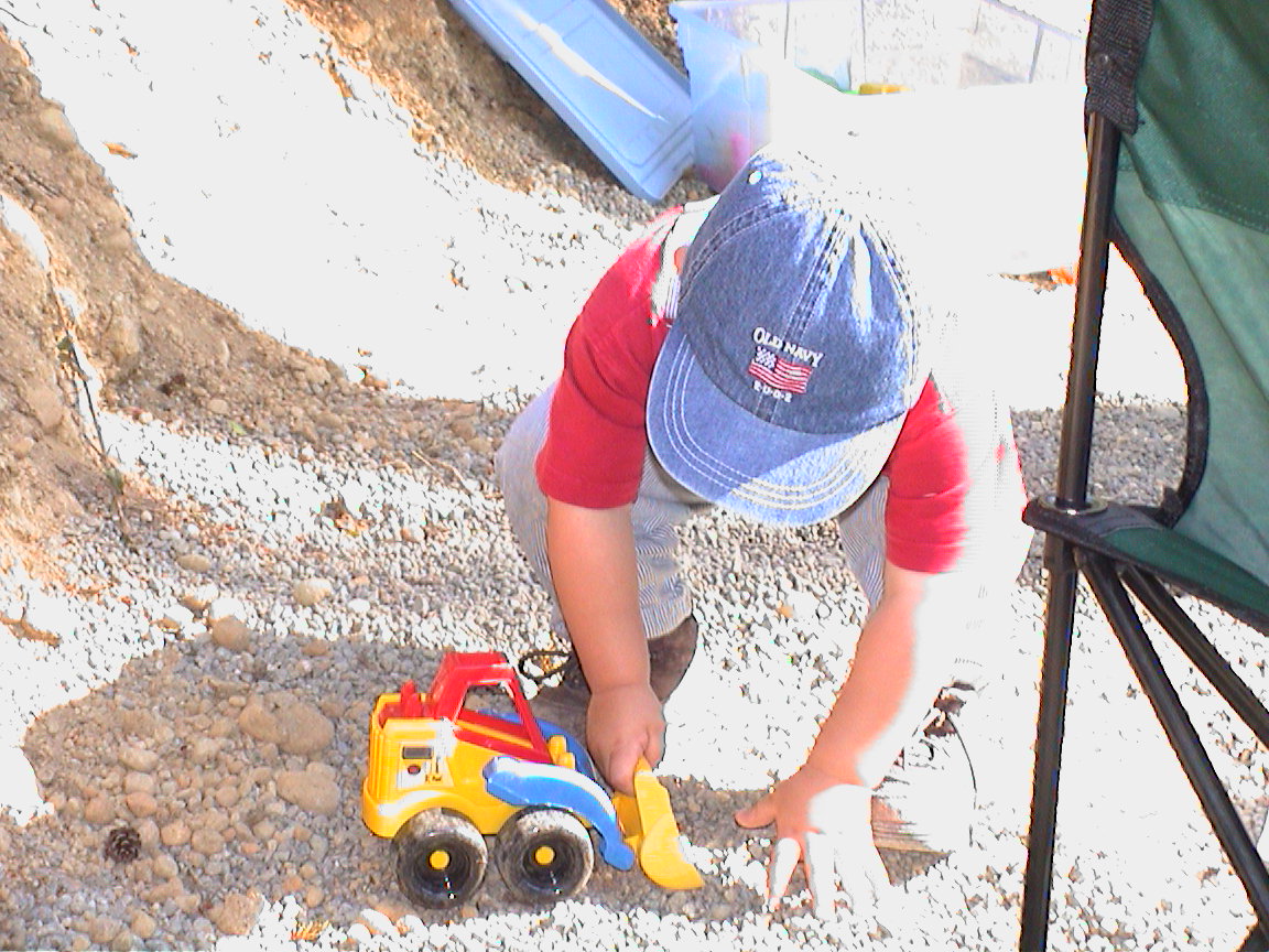 Caption: Logan putting pea gravel in the front end loader.
