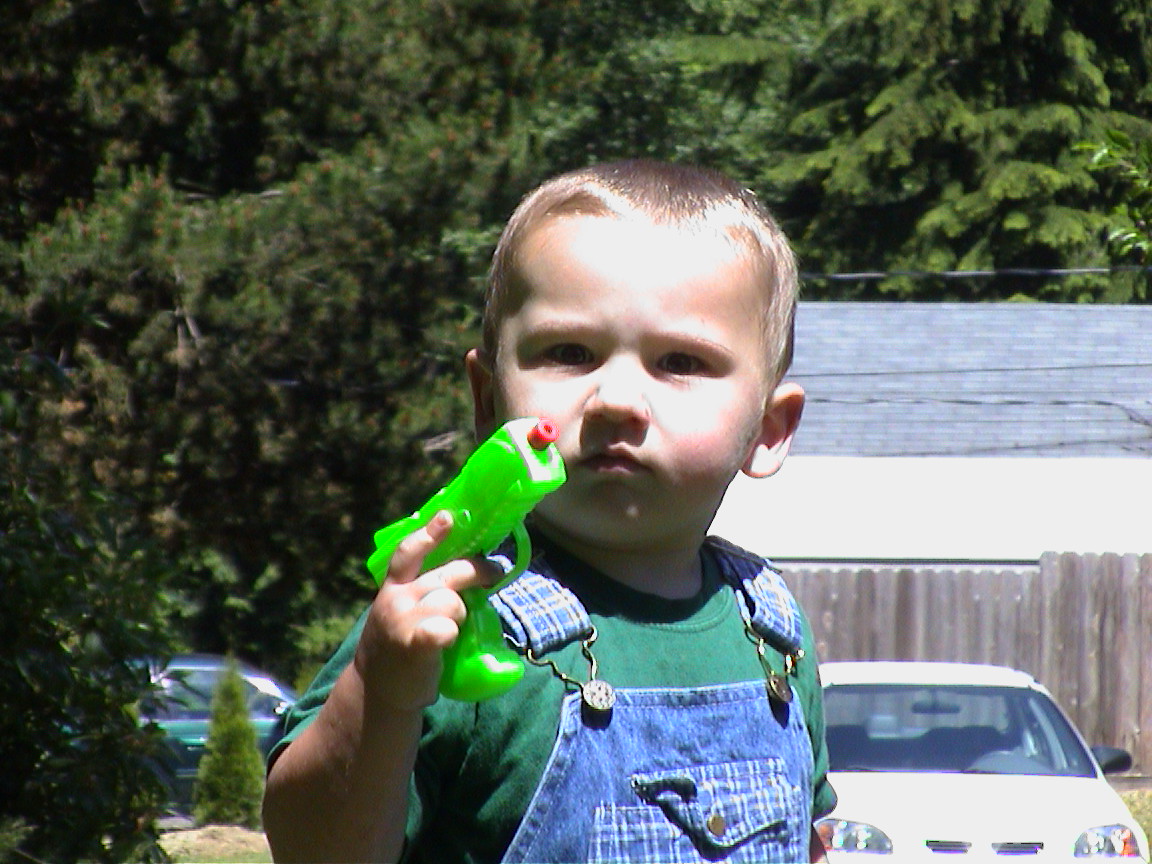 Caption: Logan and his squirt gun.