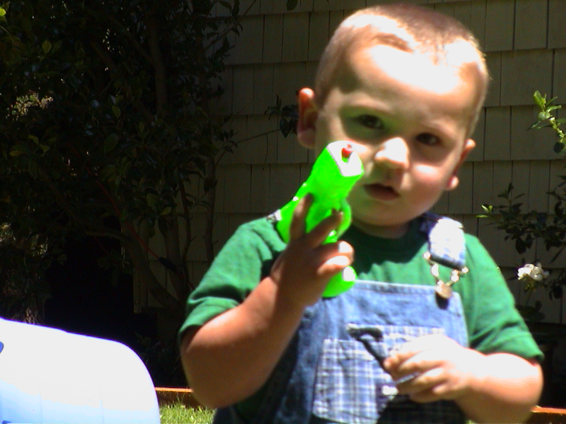 Caption: Logan posing with squirt gun.