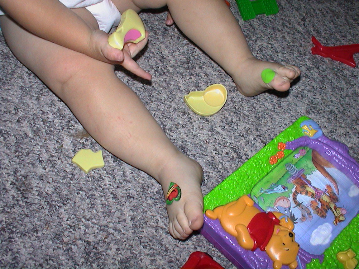 Caption: Thought this was a cute pic. Logan has an owie on his left foot (lime green band aid) but he went and found a sticker for the other foot.