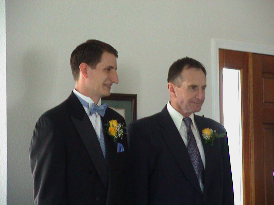 Caption: Jacob and his dad waiting for Jenny to come down the stairs.